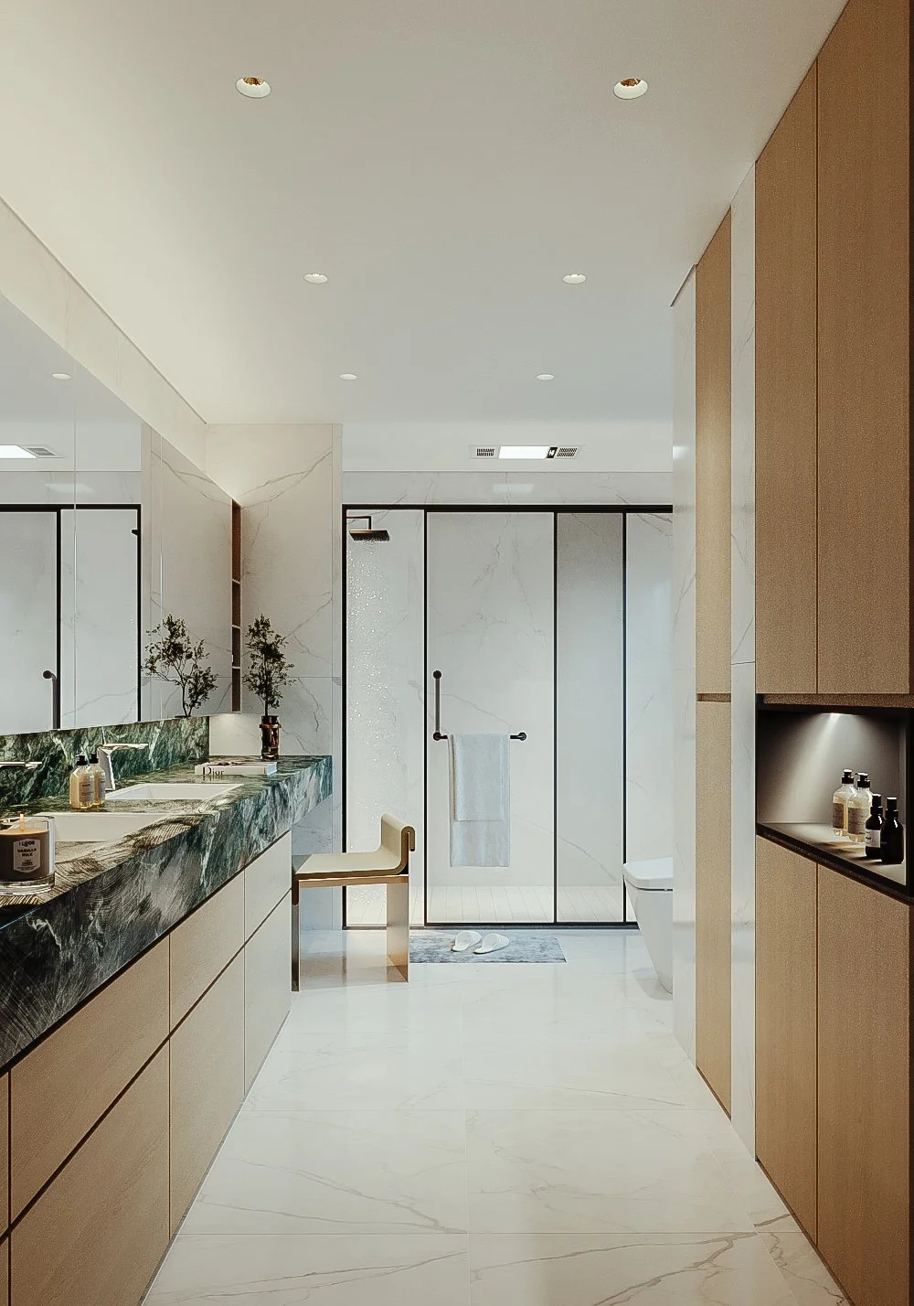 MATERIALS: wood finishes, metal lines, marble, wallcoverings.