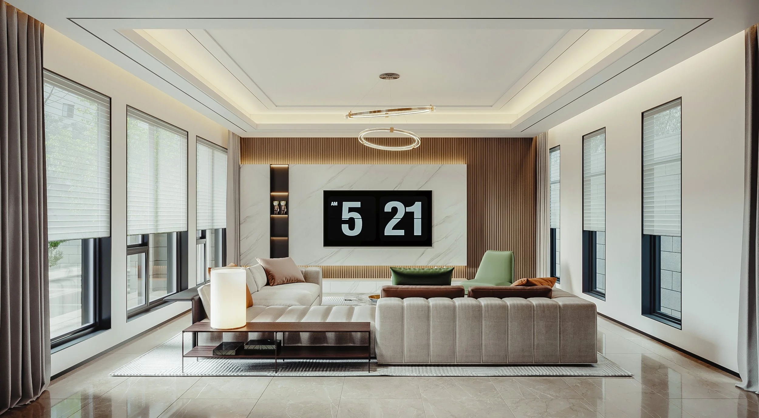 MATERIALS: Marble wall panels, wood veneer, art paint and metal sheets.